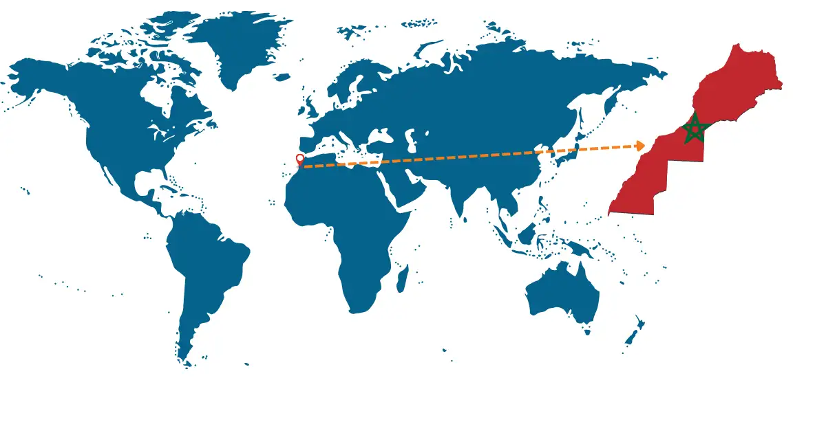 World map showing Morocco's location in North Africa, with directional travel path from North America to Morocco